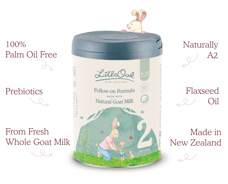 Full Cream Goat Milk Solids, Lactose (Milk), LittleOak Proprietary Oil Blend (Sunflower Oil, High Oleic Sunflower Oil, Pressed Coconut Oil, Pressed Flaxseed Oil), Galacto-oligosaccharide (GOS) (Milk), Minerals (Tricalcium Phosphate, Calcium Citrate, Trisodium Citrate, Magnesium Sulphate, Ferrous Lactate, Zinc Sulphate, Copper Gluconate, Sodium Selenite, Manganese Sulphate, Potassium Iodide), DHA Powder (Docosahexaenoic Oil from Schizochytrium sp.), Amino Acids (L-Tyrosine, L-Cysteine, L-Leucine, L-Tryptophan, L-Isoleucine), ARA Powder (Arachidonic Acid Oil from Mortierella alpine, Sodium Caseinate (Milk)), Choline, Vitamins (Vitamin C, Vitamin E, Vitamin B3, Vitamin A, Vitamin D3, Vitamin B5, Vitamin K1, Vitamin B1, Vitamin B6, Vitamin B2, Vitamin B12, Folic Acid, Biotin), Inositol, Antioxidant (α-Tocopherol), L-Carnitine.